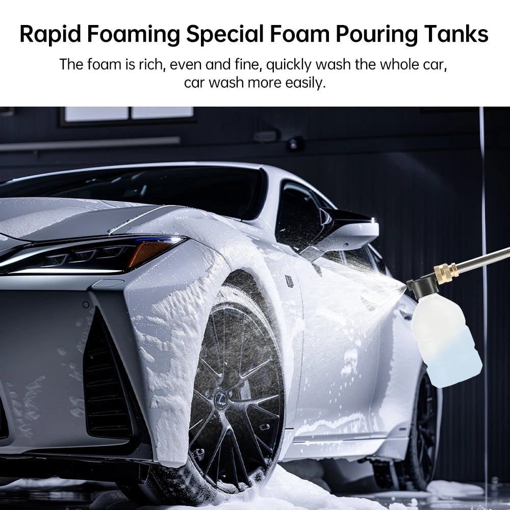 Incluye la pistola, batería de litio, cargador, manguera de 5 m, boquillas intercambiables, varilla metálica, hervidor de espuma, filtro, guantes, interfaz de botella y maletín de transporte rígido.